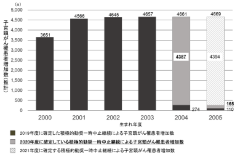 2019年度までに積極的勧奨が再開されなかったことにより、2000~2003年度生まれにおける子宮頸がん罹患者増加数が確定した。現在(2020年度)、2004年度以降生まれにおける子宮頸がん罹患者増加数が確定していっており、特に2004年度生まれで推計4387人の増加が確定しつつある。