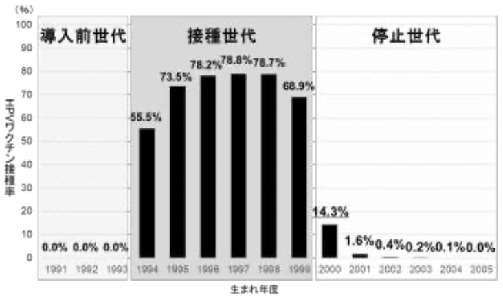 第16回厚生科学審議会予防接種・ワクチン分科会副反応検討部会、平成27年度第6回薬事・食品衛生審議会医薬品等安全対策部会安全対策調査会の資料で公表されている推計方法においては市町村との実数調査と乖離しており、地域保健・健康増進事業報告および国税調査のデータをもとに再計算を行った。2000年度生まれの接種率は14.3%、2005年生まれ以降はさらに減少している。