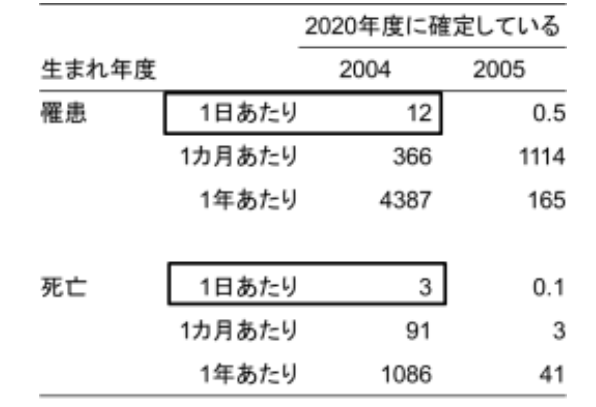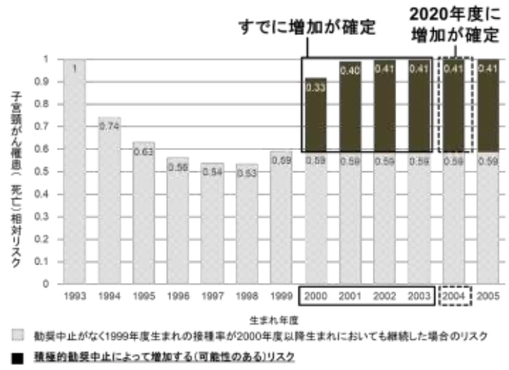 現在(2020年度)、2004年度生まれにおいて、1日あたり12人の子宮頸がん罹患増加および1日あたり3人の死亡増加が確定しつつある。